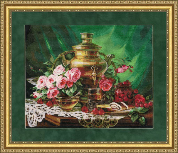 Старинный самовар находится в полной готовности порадовать дружную компанию горячим чаем. Для этого есть всё – неописуемый аромат чайных роз, спелые ягоды рябины и главный «гвоздь» чаепития – сладкий пчелиный мёд. Глядя на картину так и хочется протянуть руку к чашке чая, и выпить его вместе с мёдом, намазанным на тонкий ломтик рулета. Атмосфера картины наполнена необычным стилем жизни, уносящим собеседников в старинные дали.| Скидка | 3 % | 5 % | 7 % | 10 % | 15 % |